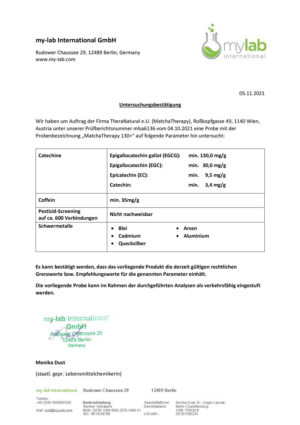 Jede unserer MatchaTherapy™ - Sorten wurde sorgfältig selektiert und von einem unabhängigen akkreditierten Labor in Deutschland auf Catechin-Mengen, Pestizide, Schwermetalle, und Verunreinigungen getestet.