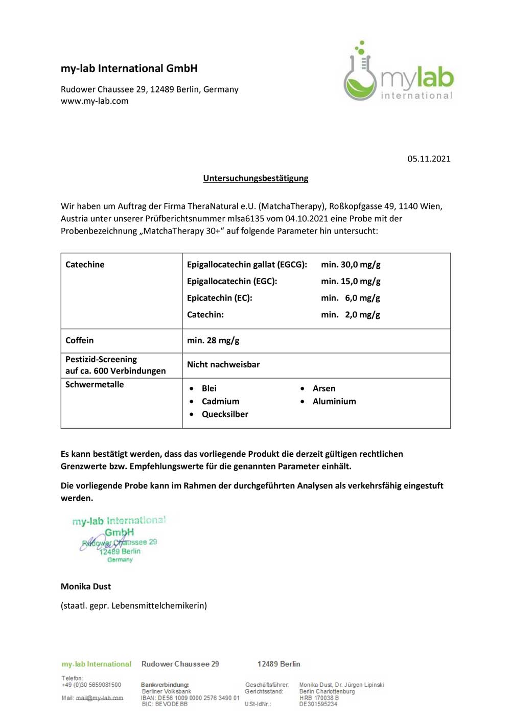 Jede unserer MatchaTherapy™ - Sorten wurde sorgfältig selektiert und von einem unabhängigen akkreditierten Labor in Deutschland auf Catechin-Mengen, Pestizide, Schwermetalle, und Verunreinigungen getestet.