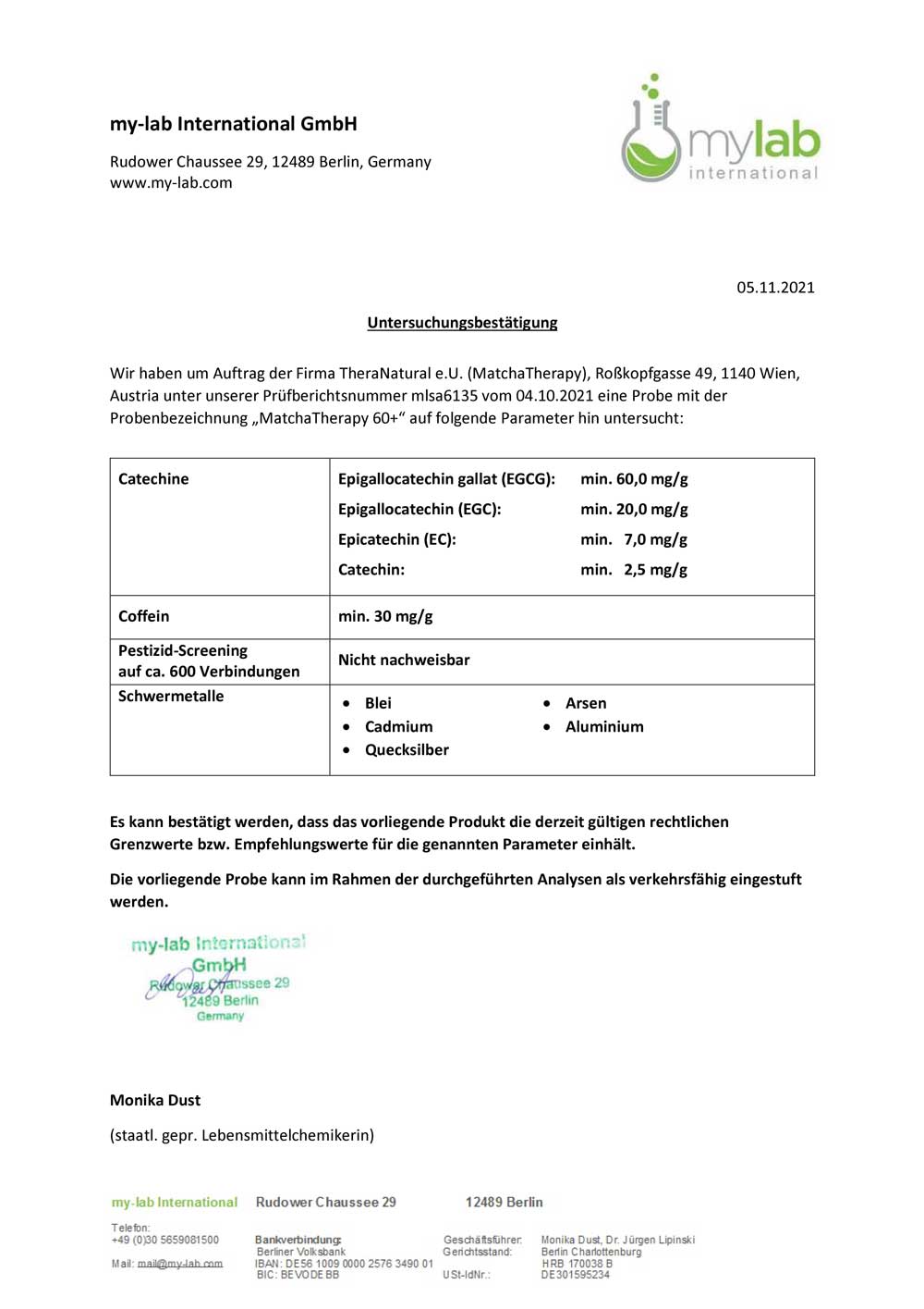 Jede unserer MatchaTherapy™ - Sorten wurde sorgfältig selektiert und von einem unabhängigen akkreditierten Labor in Deutschland auf Catechin-Mengen, Pestizide, Schwermetalle, und Verunreinigungen getestet.